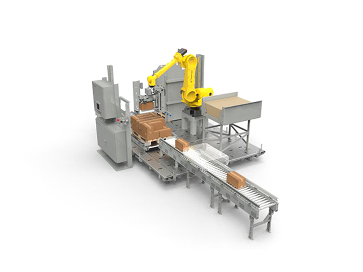 平板上工件符合栈板要求的一层工件,平板及工件向前移动直至栈板垂直面。上方挡料杆下降,另三方定位挡杆起动夹紧,此时平板复位。各工件下降到栈板平面,栈板平面与平板底面相距10mm,栈板下降一个工件高度。往复上述直到栈板堆码达到设定要求。码垛机器人配备有特殊定制设计的多功能抓取器,不管包装箱尺寸或重量如何,机器人都可以使用真空吸盘牢固地夹持和传送包装箱